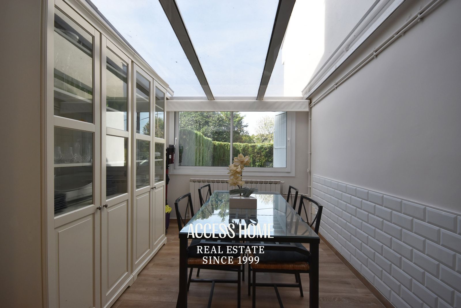 A continuación, encontramos un espectacular salón-comedor con chimenea, muy luminoso gracias a sus grandes ventanales que se abren directamente al jardín privado. La cocina office, moderna y totalmente equipada (incluye nevera americana y lavavajillas), se integra perfectamente en el espacio, junto a una agradable zona de comedor. Destaca su techo panorámico acristalado, que aporta una extraordinaria luminosidad y puede cubrirse mediante cortina motorizada.