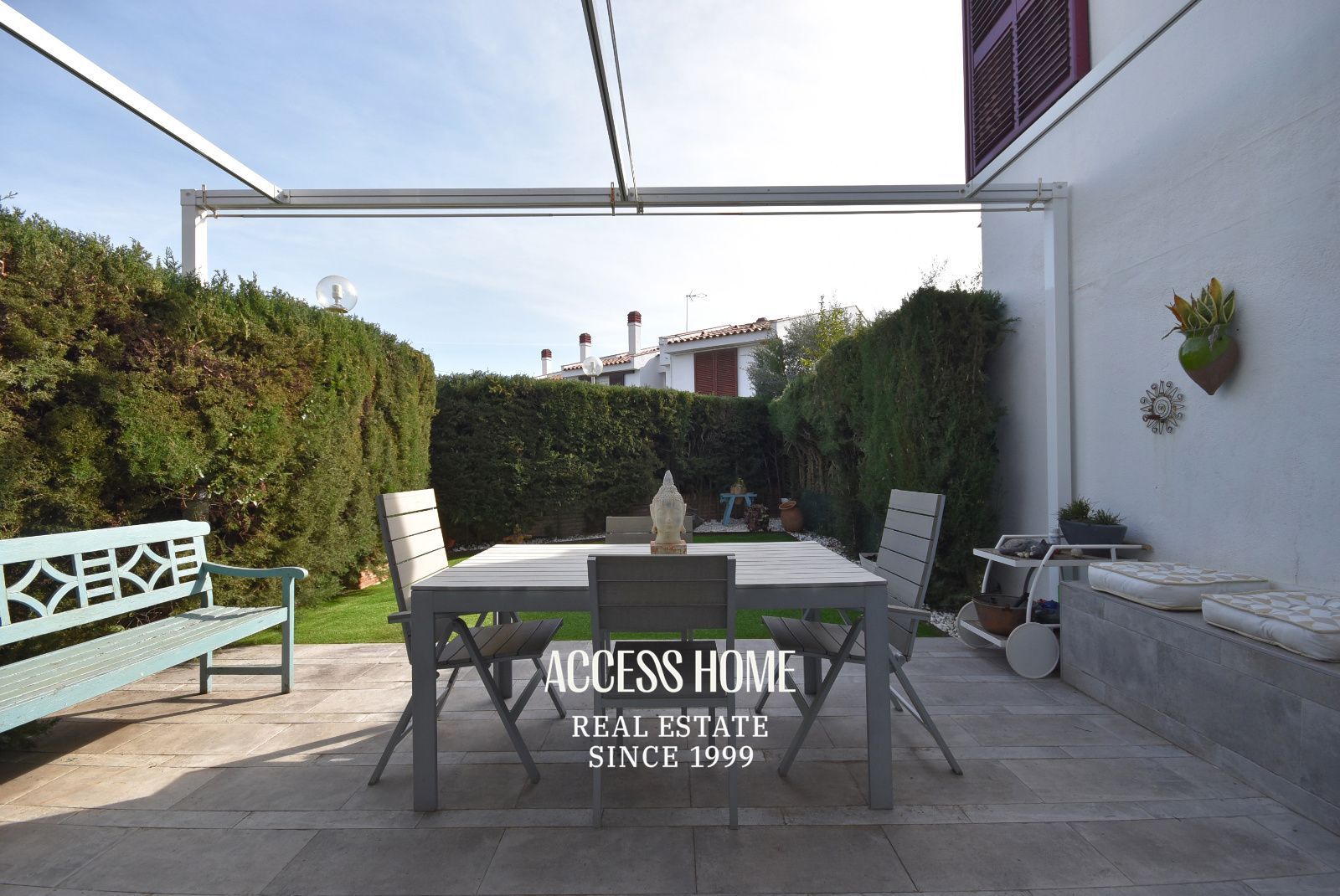 El jardín combina césped artificial y una zona embaldosada con pérgola practicable,. Desde aquí se accede directamente a la zona comunitaria con piscina.