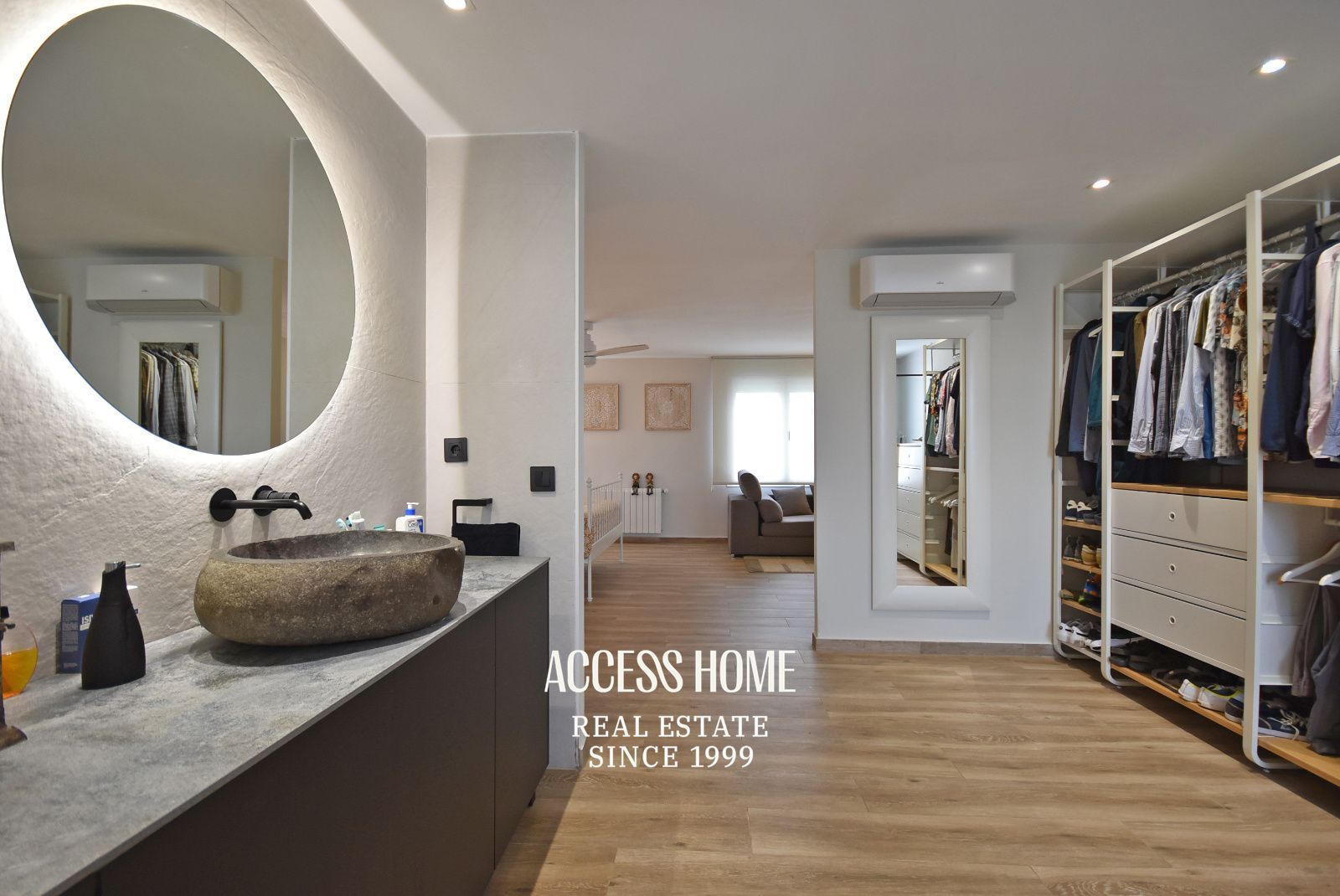 En la planta superior se encuentra un dormitorio doble con armarios empotrados y un baño completo con ducha. El dormitorio principal en suite, de concepto abierto, ofrece un amplio espacio que integra zona de descanso, vestidor y un espacioso baño completo con ducha.