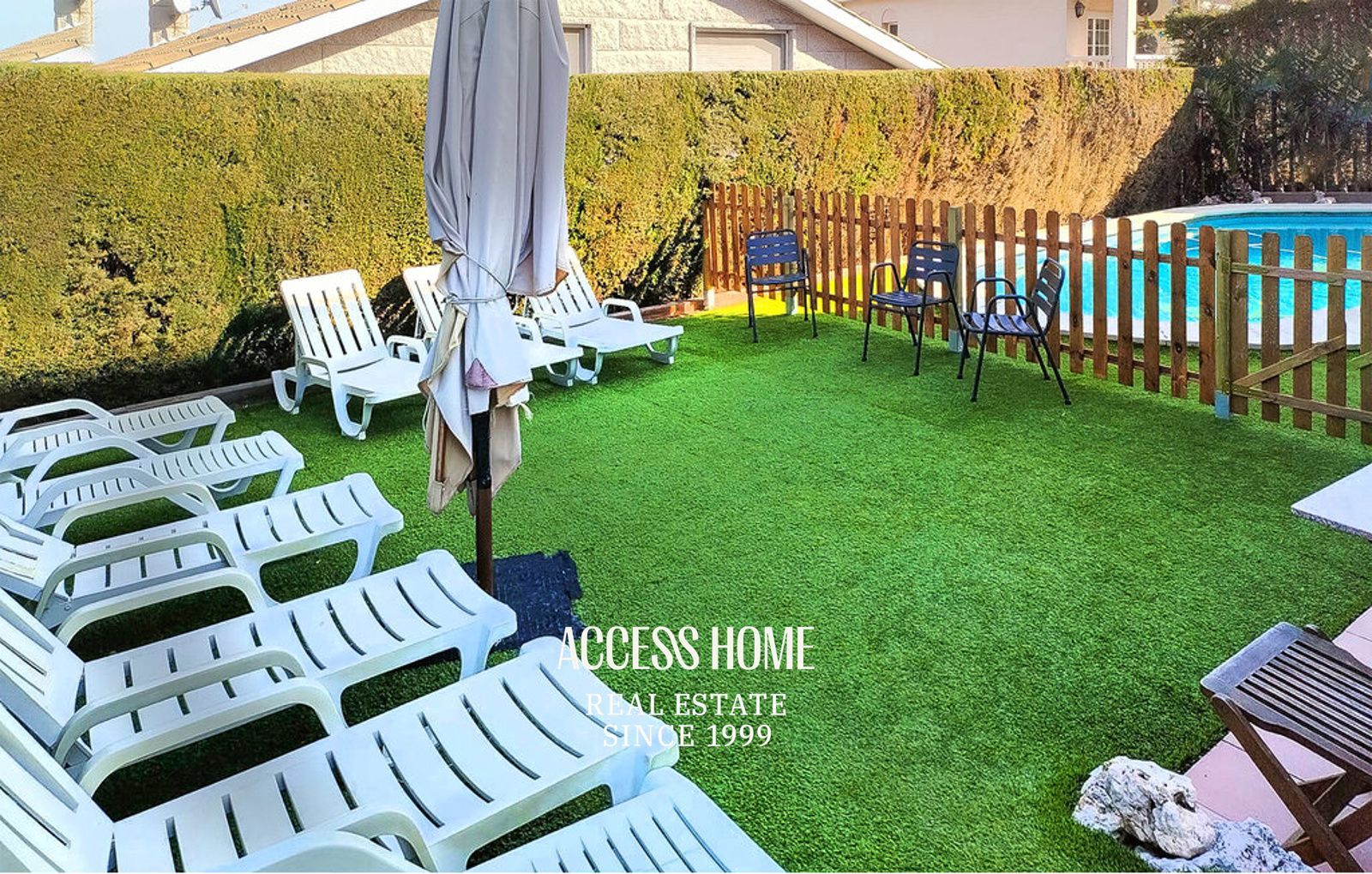 Los exteriores están cuidadosamente organizados con piscina salina, terrazas, porches y zonas de descanso, rodeadas de jardines que ofrecen privacidad y permiten disfrutar del estilo de vida mediterráneo.