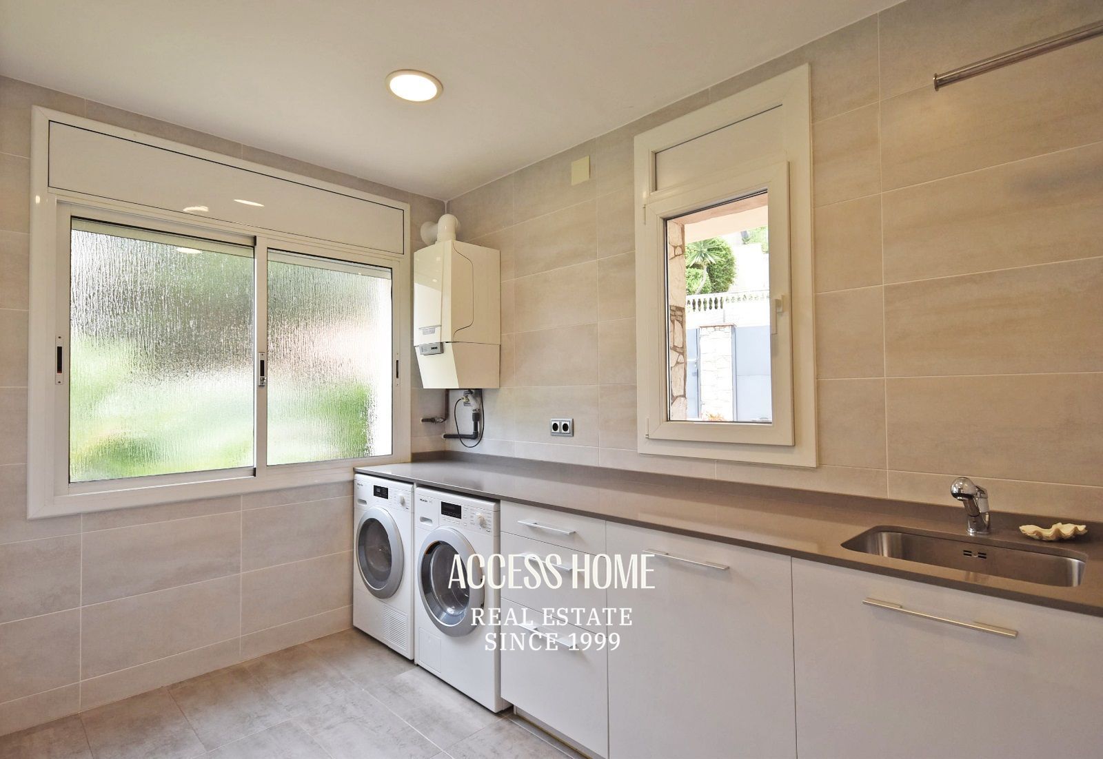 La casa cuenta con excelentes acabados: suelos de madera y cerámica, carpintería exterior de PVC, calefacción por radiadores de gas natural, toldos eléctricos, carpintería interior lacada de color blanco, paneles solares y aerotérmia.