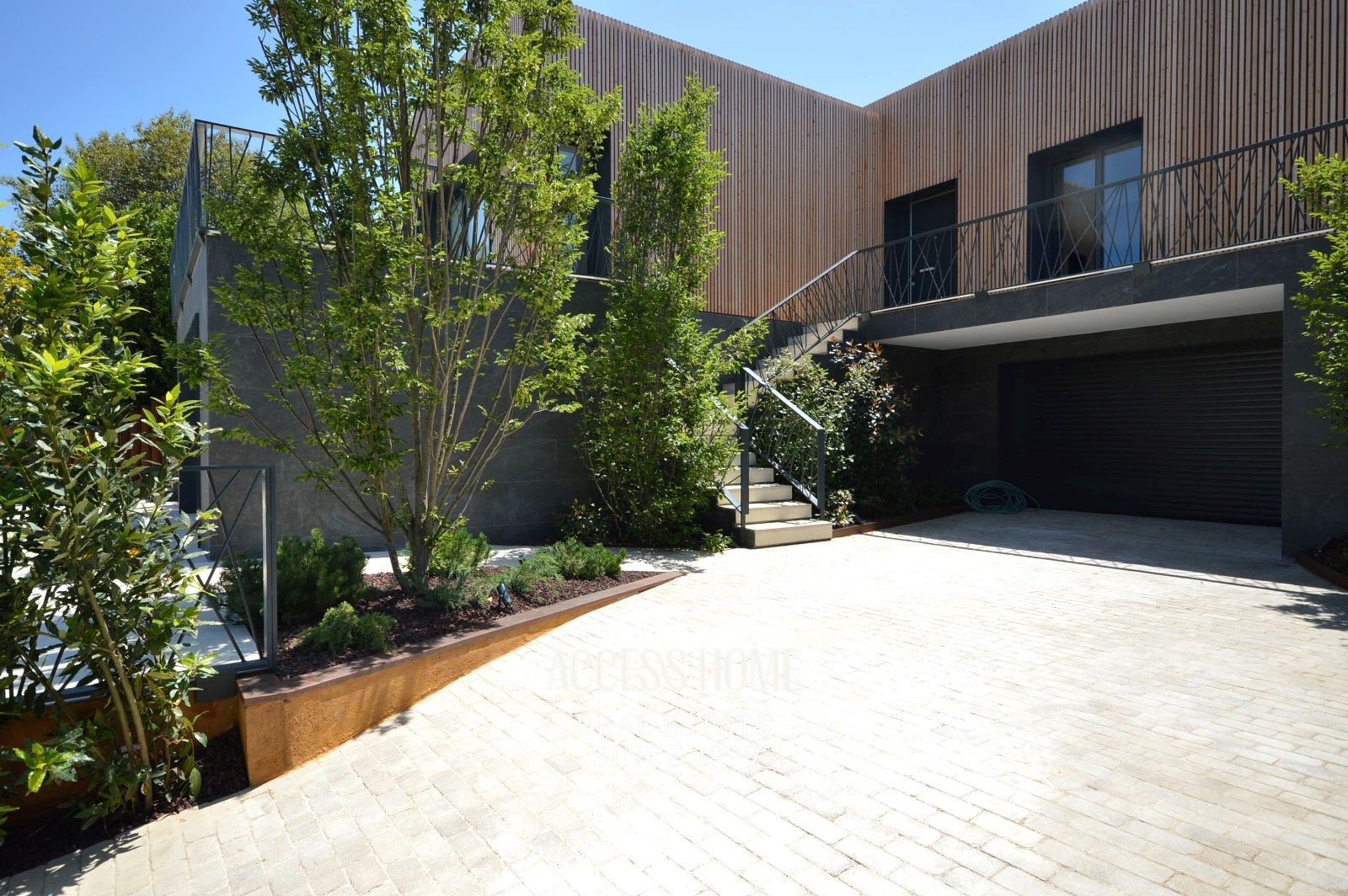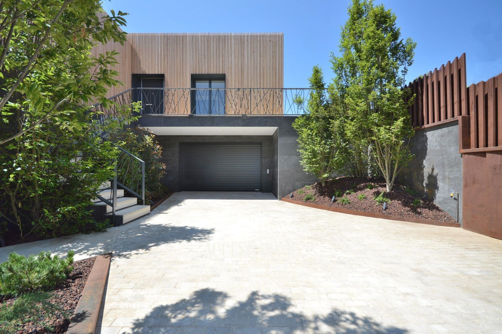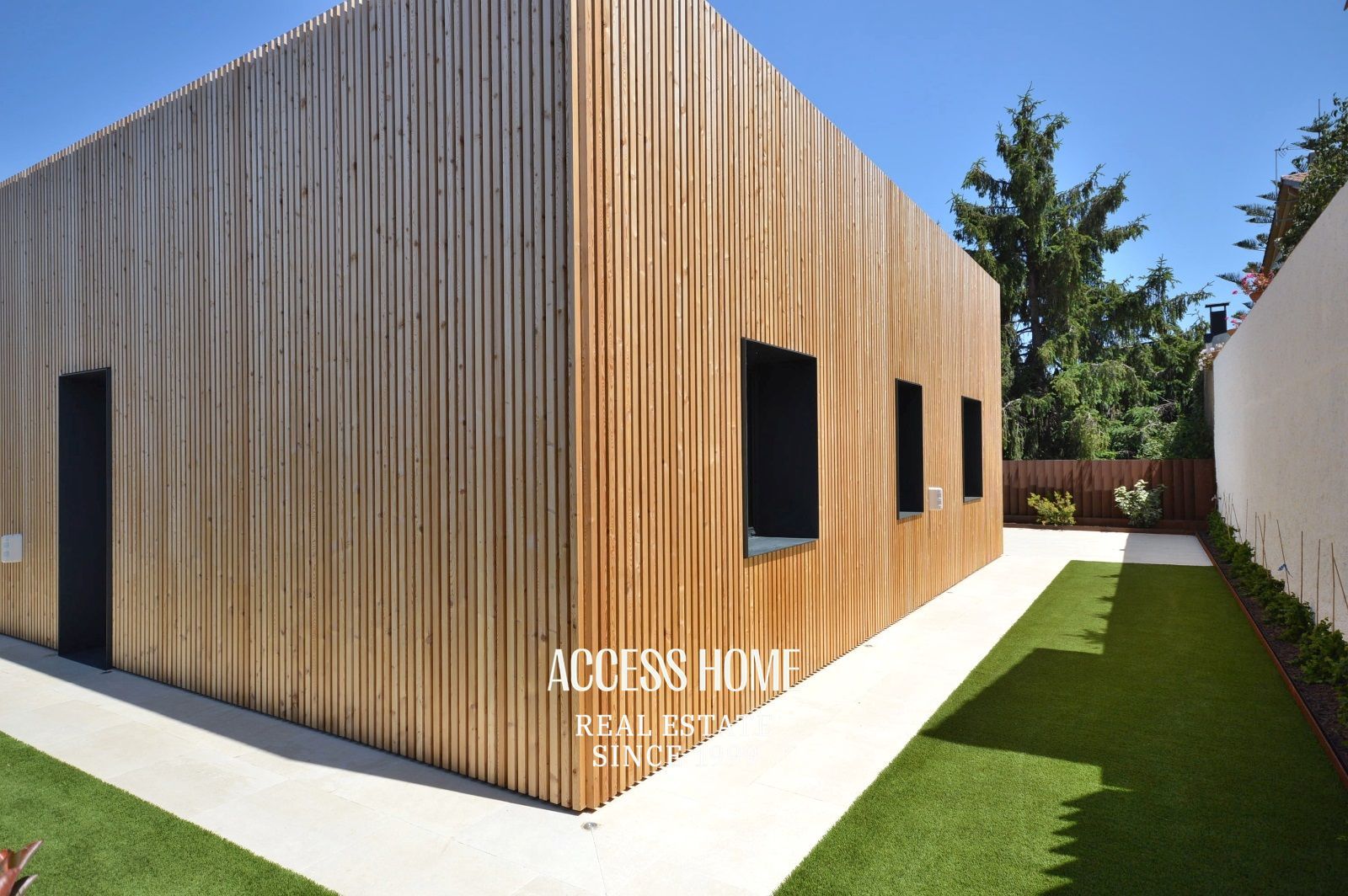 La casa, construida sobre una parcela ajardinada de 577m², cuenta con acabados y materiales de altísima calidad que ofrecen un aspecto visual único. Al acceder a la vivienda nos encontramos con un entorno encantador cuidadosamente diseñado, donde la fachada, revestida con madera de alta calidad, cobra un protagonismo claramente diferenciado.